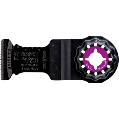 Das Bosch Tauchsägeblatt AIZ 32 APT MultiMax für Multifunktionswerkzeuge 32 mm eignet sich ideal für breite Schnitte in gehärtetem Metall, in Metallbleche, in Gipskartonplatten, in Zementfaserplatten und in faserverstärkte Kunststoffe. Die hochwertigen Hartmetallzähne des Blatts sind besonders verschleißfest und robust und zertrennen auch Material wie gehärtetes Eisen und abrasives Material wie Epoxid, GFK (glasfaserverstärkten Kunststoff) und CFK (kohlefaserverstärkten Kunststoff). Die abgerundete Blattspitze (Curved-Tec) verhindert Zahnbruch und erhöht die Haltbarkeit des Blatts. Zugleich ermöglicht sie Ihnen besonders breite Tauchschnitte ohne Rattermarken und Abplatzungen. Das Profi-Aufnahmesystem für das Sägeblatt sorgt zudem für eine maximale Kraftübertragung zwischen Maschine und Blatt.