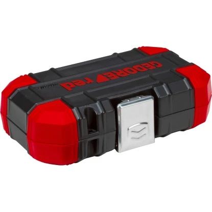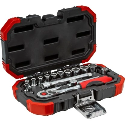 Der 16-teilige Gedore Steckschlüssel Satz R49003016 ist nach DIN 3120 und DIN 3122 gefertigt. Das gesammte Set hat einen 6,3 mm (1/4″) Innenvierkant-Antrieb. Es wird in einem praktischen Koffer mit Metallscharnieren und Verschlüssen mit klemmgesicherten Werkzeugen geliefert. Die Beschriftung im Koffer ermöglicht ein rasches Finden der passenden Einsätze oder Bits. Die Umschaltknarre verfügt über einen Rechts-/Linkslauf mit Hebelumschaltung und einem Rückschwenkwinkel von 5°. Er ist feinverzahnt mit 72 Zähnen. Die insgesamt 12 metrischen Sechskant Steckschlüsseleinsätze haben Schlüsselweiten von 4 mm – 13 mm. Zusätzlich ist eine Verlängerung 10 cm und ein Bit-Adapter 6,3 mm (1/4″) beigelegt. Der Quergriff mit Gleitstück ist 11,5 cm lang. Die Oberfläche ist matt verchromt. Ein Qualitätsprodukt made by Gedore.