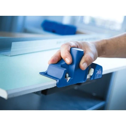 Der LUX-TOOLS Kantenhobel ist ein praktisches Werkzeug für die Kantenbearbeitung. Hergestellt wird der Hobel aus verstärktem Nylon in der Farbe Blau. Das Material ist robust und sehr leicht. Mittels zwei scharfer Klingen, die fest mit dem Hobel verschraubt sind, können Sie schnell und exakt Stoßkanten an Rigipsplatten zuschneiden. Die vordere Klinge ist auf verschiedenen Plattenstärken von 9,5 mm bis 15 mm einstellbar. Die hintere Klinge ist fest in einem Winkel von 45° arretiert und schneidet gleichzeitig eine kleine Fase zur Fugenspachtelaufnahme in den Gipskarton. Sie können beide Klingen mit nur wenigen Handgriffen auswechseln, wenn sie stumpf geworden sind. Die passenden Ersatzklingen sind separat erhältlich.