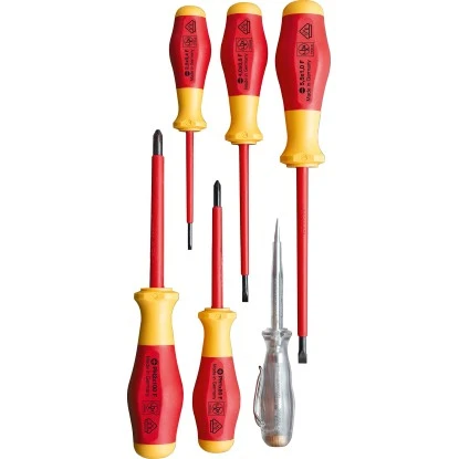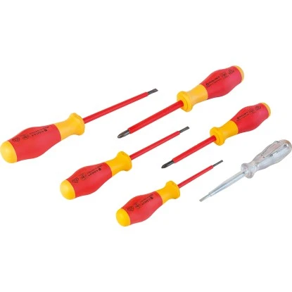 – 5 VDE-Schraubendrehern mit gängigen Schlitz – und Kreuzantrieben mit den folgenden Abmessungen: Schlitz 2,5 x 0,4 mm, 4,0 x 0,8 mm, 5,5 x 1,0 mm, Kreuz PH1 x 80 mm und PH2 x 100 mm