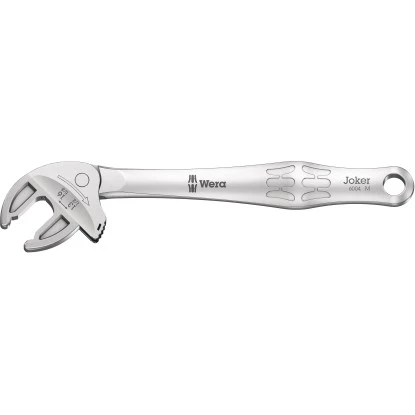 Viele Anwender wünschen sich ein universelles Schraubwerkzeug mit möglichst großem Einsatzspektrum. Ein einziges Werkzeug für mehrere metrische und zöllige Abmessungen sollte es sein. Es sollte sich automatisch auf die unterschiedlichen Schraubengrößen einstellen. Sicher zupacken, nichts beschädigen und eine hohe Arbeitsgeschwindigkeit ermöglichen. Durch die stufenlos und parallel geführten Backen werden mehrere Maulschlüssel-Einzelabmessungen ersetzt. Die benötigte Größe stellt sich beim Ansetzen an der Sechskant-Mutter oder -Schraube stufenlos von selbst ein. Der integrierte Hebelmechanismus klemmt die Sechskant-Schraube bzw. -Mutter zwischen den Backen sicher ein, was die Gefahr des Abrutschens und der Beschädigungen deutlich verringert. Für das schnelle und durchgängige Schrauben ohne Absetzen sorgt die Ratschenfunktion. Durch die Nutzung der Eckweiten-Prismen ist ein Rückschwenkwinkel von nur 30° realisierbar. Die Ein-Schenkel-Konstruktion in Verbindung mit der Ratschenfunktion und dem Eckweitenprisma ermöglicht das Arbeiten auch in engen Bauräumen. Der verstellbare Joker 6004 ist das universelle Schraubwerkzeug. Selbstjustierend. Zupackend. Ratschend.